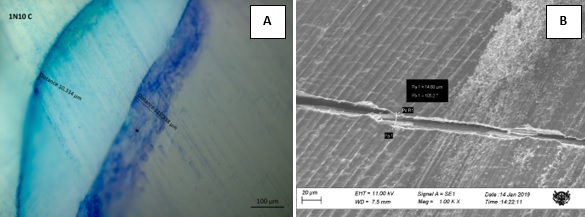 Para la evaluación de la microfiltración, las muestras fueron seccionadas en cortes sagitales mediante el uso de un disco diamantado acoplado a un micromotor de baja velocidad. Dichos cortes se realizaron a lo largo de la superficie vestibular, atravesando la zona media de cada una de las 20 carillas cementadas, lo que permitió obtener dos mitades por muestra. Estas se enviaron al laboratorio para su análisis bajo un microscopio de polarización (Axio Imager®), con el fin de observar el grado de microfiltración presente.