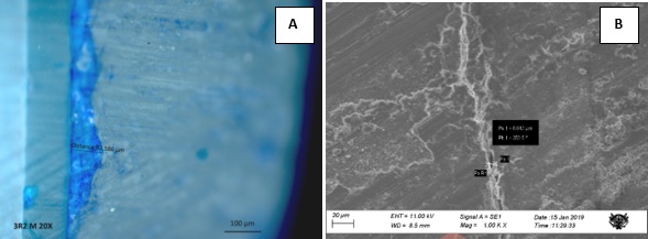 Figura 4. A) Microfiltración observada en microscopio de polarización de una carilla con resina termomodificada. B) Microscopía electrónica del agente cementante de resina termomodificada.