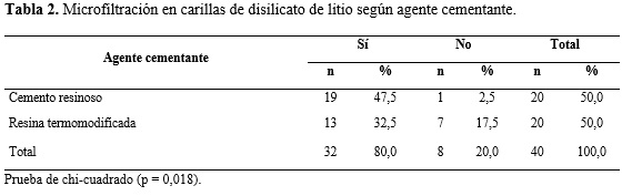 Al comparar la incidencia de microfiltración entre ambos materiales cementantes, se identificó un mayor porcentaje de microfiltración en el grupo cementado con cemento resinoso (47,5 %; n = 19) en comparación con el grupo cementado con resina termomodificada (32,5 %; n = 13). Estos valores son estadísticamente significativos según la prueba de chi-cuadrado (p = 0,018) (tabla 2).