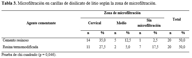 Resultados: Se observó un mayor porcentaje de microfiltración en el grupo cementado con cemento resinoso (47,50 %; n = 19) en comparación con el grupo tratado con resina termomodificada (32,50 %; n = 13), con un valor de p = 0,018. Asimismo, se evidenció una mayor microfiltración a nivel cervical y medio en el grupo del cemento resinoso en comparación con el grupo cementado con resina termomodificada, con un valor de p = 0,046.