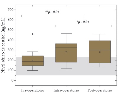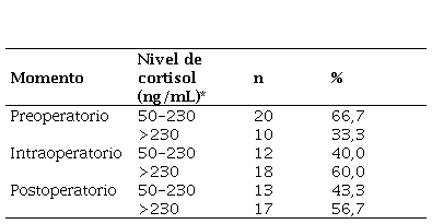 Resultados: En el preoperatorio, se encontró que el 66,7 % (n = 20) de los pacientes presentaron niveles séricos de cortisol con valores normales (50-230 ng/mL), y el 33,3 % (n = 10) tuvo niveles mayores a 230 ng/mL. En el intraoperatorio, el 60,0 % (n = 18) presentó niveles séricos de cortisol mayores a 230 ng/mL; y en el postoperatorio, el 56,7 % (n = 17) presentó niveles séricos de cortisol mayores a 230 ng/mL. Asimismo, se reportó un incremento estadísticamente significativo de los niveles séricos de cortisol en el momento intraoperatorio (285,53 ± 108,00 ng/mL) respecto al preoperatorio (198,00 ± 74,85 ng/mL), el cual se mantuvo hasta el postoperatorio (280,67 ± 113,09 ng/mL) sin presentar diferencias estadísticamente significativas.