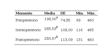 En el momento intraoperatorio, que inicia al anestesiar la cavidad bucal, inmediatamente el HHA y el sistema nervioso simpático reciben la alerta sistémica que origina un incremento en el cortisol en plasma, esto independientemente del factor psicológico (12, 15-17). De acuerdo con los resultados reportados, los valores obtenidos en este momento presentaron diferencias estadísticamente significativas respecto al momento preoperatorio, y, según la literatura, pueden mantenerse durante solo unos minutos. Dicho aumento puede estar influenciado por la complejidad de la intervención quirúrgica, la falta de control y el grado de asistencia que recibe el paciente (18-20).