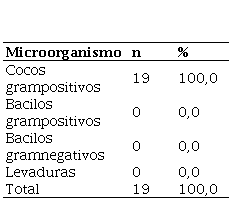 Asimismo, se observó exclusivamente el crecimiento de cocos grampositivos en el medio de cultivo con AS. No se evidenció desarrollo de bacilos grampositivos, bacilos gramnegativos ni levaduras (tabla 2).