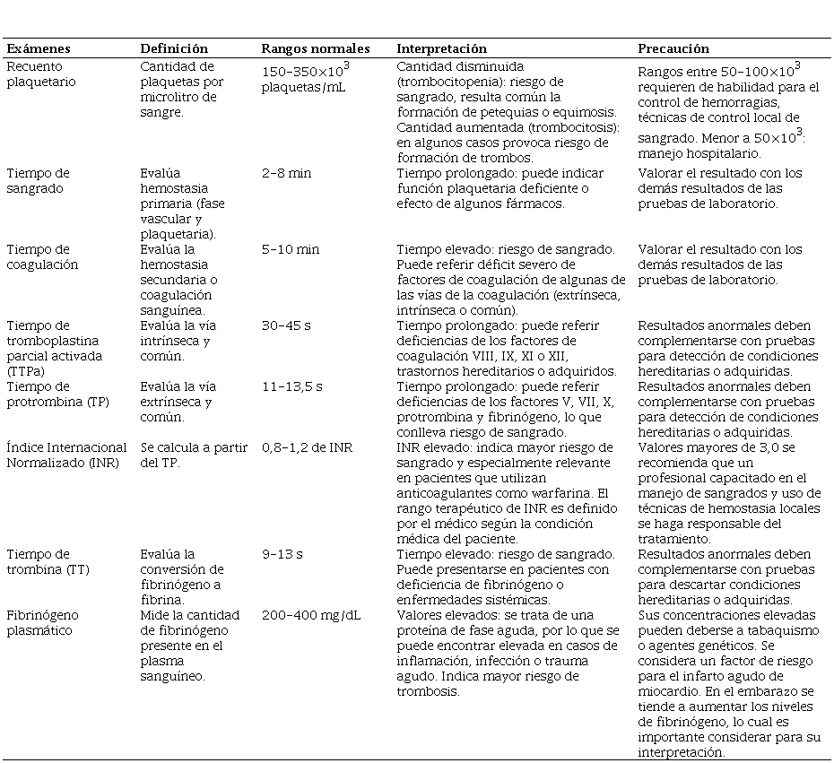 El perfil de coagulación, o coagulograma, permite evaluar de manera cualitativa y cuantitativa el proceso de hemostasia según el modelo clásico. Este perfil incluye el recuento de plaquetas, los tiempos de sangrado, de coagulación, de tromboplastina parcial activado y de protrombina, y el INR (3). Cada una de estas pruebas paramétricas se utiliza para evaluar etapas específicas de la hemostasia. El tiempo de sangrado (TS) se emplea para valorar la hemostasia primaria. La hemostasia secundaria se evalúa globalmente mediante el tiempo de coagulación (TC), mientras que las vías individuales se valoran con el tiempo de protrombina (PT), que también se expresa como INR para la vía extrínseca, y el tiempo de tromboplastina activada (aPTT) para la vía intrínseca (2) (tabla 1).