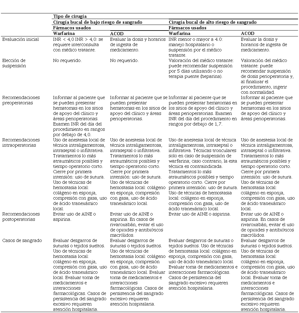 Los procedimientos orales de bajo riesgo de sangrado pueden efectuarse con seguridad, sin necesidad de interrumpir la terapia anticoagulante. Entre estos se incluyen: obturaciones dentales, raspado y alisado radicular, pulido dental, biopsias pequeñas de tejidos blandos, prostodoncia, endodoncia, colocación de implantes, y exodoncias de menos de tres dientes a la vez. Los procedimientos de riesgo moderado y alto, que presentan mayor probabilidad de sangrado, incluyen a las exodoncias múltiples de cinco o más dientes, limpiezas subgingivales extensas, cirugía periodontal, exodoncias con colgajo mucoperióstico, extracciones óseas, biopsias de tejidos blandos con dimensiones mayores a 2,5 cm, biopsias óseas, colocación de múltiples implantes, extirpación de quistes y resección de tumores de cabeza y cuello. En estos casos, se debe evaluar la necesidad de continuar o suspender el tratamiento anticoagulante, considerando las comorbilidades del paciente (4, 5, 18-20).