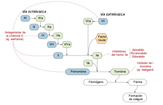 En la última década, los ACOD han transformado la terapia anticoagulante, volviéndose una alternativa a los AVK y ganando importancia en la práctica clínica (7). Estos ofrecen un perfil farmacocinético más predecible, con un rango terapéutico más amplio, efecto rápido (entre 2 y 4 horas tras su administración), vida media más corta, dosificación fija sin necesidad de controles regulares ni monitorización de INR, y mínimas interacciones con otros fármacos y alimentos. Sin embargo, su costo elevado y limitaciones en pacientes con insuficiencia renal han impedido su adopción masiva. Estos anticoagulantes se dividen en dos categorías: inhibidores directos de la trombina (FIIa) e inhibidores directos del factor X activado (Xa), enzimas cruciales en la fase final de la coagulación, que logran un inicio de acción rápido, similar al de las heparinas subcutáneas (3, 11,12).