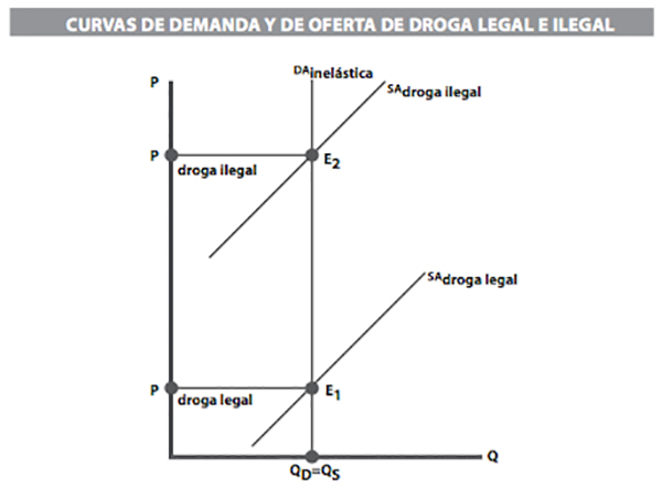 Donde las curvas de oferta y demanda se cruzan, está el equilibrio de demanda y oferta en el mercado. La característica peculiar del mercado de drogas es que, por el combate a la droga ilícita, la curva de oferta se mueve a la izquierda, cruzando la curva de demanda, que es inelástica, más arriba. En consecuencia, el fruto del combate violento a la compraventa de droga ilícita es que aumenta astronómicamente el precio de la droga, sin que disminuya la cantidad demandada y ofrecida.