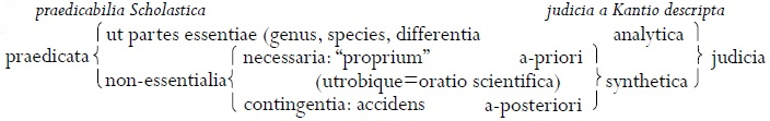 Videamos quomodo res logice se habeat. Rebus characteres (proprietates, "essentiae") et necessarii et contingentes conveniunt (quod non est nisi scholastica "predicabilium" doctrina vel Kantiana "judiciorum" divisio).7 Socrates scilicet, si non calveret, esse pergeret, minime tamen si "homo" non diutius esset; calvitium quidem est character contingens, necessarius tamen humanitas.
