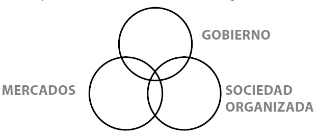 En aquellos reportes, el Banco Mundial argumenta que las problemáticas relacionadas con la efectividad gubernamental y el desarrollo humano son fruto de la agregación de muchos actores, instituciones y recursos, por lo que las políticas públicas sólo serán sustentables en la medida en que converjan los gobiernos, los mercados y la sociedad organizada en su definición, implementación y evaluación (World Bank, 1989; 1992). Esta proposición, muchas veces representada con un diagrama de Venn en el que tres conjuntos de igual tamaño comparten un área superpuesta, es fundamentalmente normativa; es decir, indica cómo se piensa que deberían realizarse los procesos del gobierno, no necesariamente cómo se realizan en la práctica (ver esquema 1). La idea de la convergencia / cooperación intersectorial como parte de la gobernanza ya ha adquirido un estatus canónico dentro de las ciencias políticas y los estudios del desarrollo humano. En las literaturas de la gobernanza no es posible concebir la dirección de la sociedad como resultado de un solo tipo de actor, institución o recurso, ya que, por definición, la gobernanza es inter-sectorial y aspira al co-gobierno.