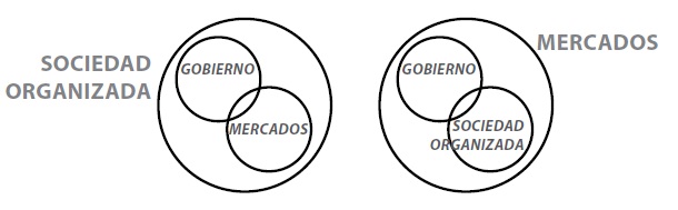 Sin embargo, más allá del presupuesto de que la convergencia intersectorial es plausible y racional, el modelo canónico no elabora acerca de las dificultades concretas vinculadas con las dinámicas de poder y con las de la implementación. Los tres conjuntos de igual tamaño, que comparten áreas de igual extensión, parecen proponer relaciones de interdependencia en las que los actores, instituciones y recursos intercambiados no solo son comparables, sino equivalentes. El modelo canónico sugiere que los gobiernos necesitan a las sociedades y a los mercados en el mismo grado en el que las sociedades necesitan a los gobiernos y a los mercados, y de la misma manera en la que los mercados necesitan a las sociedades y a los gobiernos. La convergencia pareciera factible porque todos necesitamos de todos, de la misma manera y en el mismo grado. Si este modo de entender la gobernanza se acompaña con presupuestos que privilegian las aproximaciones técnicas sobre las políticas, el resultado puede ser particularmente ajeno a las realidades concretas en las que no siempre existen equidistancia y equivalencia entre los actores e instituciones que cooperan.