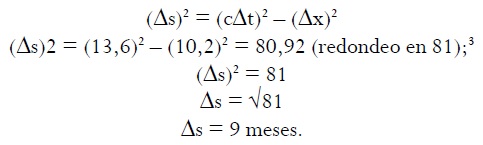 La distancia (d) recorrida por la nave al instante del nacimiento (d = producto de vt), medida desde la Tierra (sistema S), es: Δx = 10,2 meses-luz. Este es el intervalo espacial (Δx) entre el lugar en que se produce la concepción (x1) y el lugar en que se produce el nacimiento (x2). Con los valores de los intervalos Δt y Δx se puede calcular el intervalo espacio-tiempo en el sistema de referencia de la Tierra, aplicando la ecuación de Minkowski: