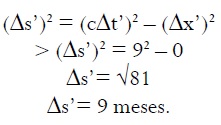 Por otra parte, en relación al sistema S’ (nave), la concepción y el nacimiento acontecen en el mismo lugar (la cama de la nave), de manera que la coordenada espacial x’ tiene el mismo valor (x’1 = x’2), por lo que el intervalo Δx’ entre los eventos evidentemente es 0. El valor de Δt’, indicado por un medidor de tiempo situado en la nave (tiempo propio), es 9 meses. Mediante la ecuación de Minkowski se observa que el valor del intervalo espacio-tiempo en el sistema de referencia de la nave es igual que en la Tierra: