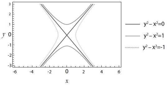 Se observan aquí, por un lado, las líneas de mundo de la luz a 45º, también la función propia de un intervalo tipo-tiempo: Δs2 = y2 – x2 = 1, a la cual corresponden las dos hipérboles comprendidas dentro del «cono de luz del pasado» (cono inferior [-y]) y del «cono de luz del futuro» (cono superior [+y]). El dato fundamental aquí es que cada punto en cada hipérbole tomada individualmente está a la misma distancia respecto del origen del sistema de coordenadas; es el modo de expresar geométricamente que el intervalo entre el origen y cualquier punto en la hipérbole es idéntico y, por ende, absoluto, independientemente de los valores que se asignen a las variables x, y.