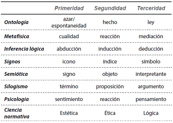 El segundo capítulo concede los cimientos que han de sostener toda la estructura, a saber, las categorías universales. La primeridad es el ámbito de la pura cualidad, ésta no es más que posibilidad, pues no se encuentra aún en relación con nada; se trata de un elemento pre-reflexivo e inmediato. La segundidad es el ámbito de los hechos brutos, es decir, de las relaciones diádicas como choques relacionales propios de la existencia fáctica. La terceridad es el ámbito de la ley y de lo general, es la relacionalidad de los objetos, pero no en el sentido de la segundidad, sino en el sentido de la inteligibilidad mediadora, como ámbito de universalidad que regula las relaciones factuales. Primeridad, segundidad, y terceridad aparecen por todas partes en el sistema, las categorías no sólo son el cimiento de la construcción, sino todo el esqueleto estructural. Por ello McNabb, buscando evidenciar de qué manera en las categorías subyacen “las bizantinas distinciones y clasificaciones en los capítulos por venir” (McNabb, 2018: 90), ofrece la siguiente figura: