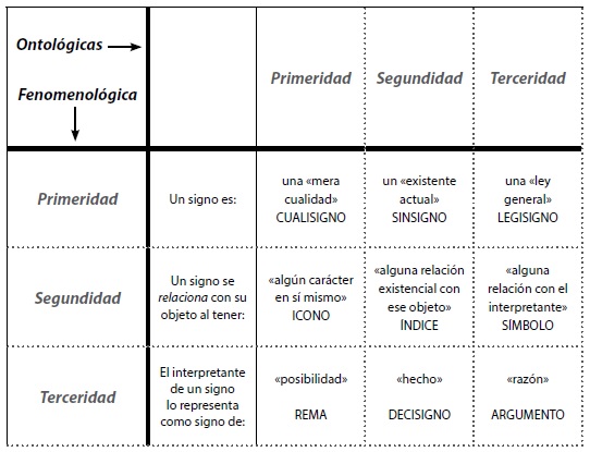 McNabb dedica un apartado a cada uno de estos tres ámbitos. En el primero, conjugando las dimensiones ontológica y fenomenológica (ambas entendidas en el contexto de la semiótica) con las tres categorías universales, se presenta la clasificación más relevante de los signos. Esa clasificación puede resumirse en la siguiente figura (Mc-Nabb, 2018: 113):