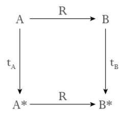 La parte izquierda del diagrama A→tA→A∗ puede interpretarse como un proceso empírico en el que se pasa del estado A al estado A∗ a través de tA. Este paso se representa por un proceso teórico consistente en el paso de B a B ∗ por tB, tal que tB es una relación lógica (o generalizando, matemática) entre B y B ∗ que corresponde a la relación tA «naturalmente necesaria», en el sentido que el diagrama conmuta. Es decir, en el sentido de que la transición de A por tA y R conduce al mismo resultado que la trnsición de A por R y tB , esto es, a B∗ (Ibarra y Mormann, 2000, 14).