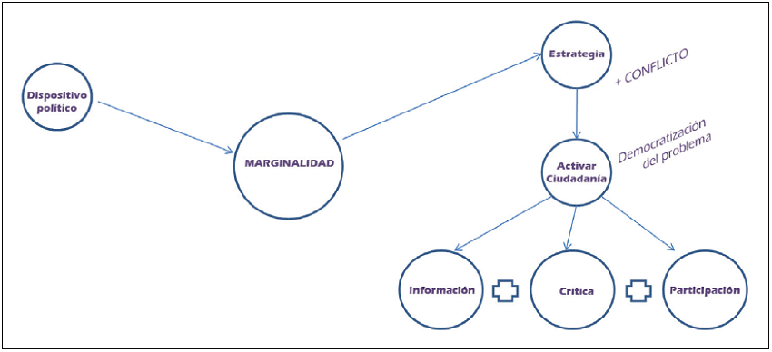 Entender la arquitectura como un dispositivo introduce la cuestión sobre la estrategia o la forma de poder que ésta ejerce en el contexto socio-espacial en el que opera. El diseño participativo es una de las propuestas metodológicas que repetidamente encontramos en los grupos socialmente sensibles que construyen la ciudad. No obstante, el concepto de participación queda cuestionado sin un componente crítico en los participantes, y la crítica es imposible sin acceso a la información por parte de los mismos. Por lo tanto, se debe realizar un estudio crítico de los nuevos planteamientos urbanos que tratan de mejorar la ciudad a través de la pequeña escala y el empoderamiento ciudadano, problematizando su capacidad de fundamentar un nuevo modelo de desarrollo urbano basado en la participación ciudadana. Entendiendo la arquitectura como dispositivo político, se pueden fundamentar estrategias de democratización de los problemas urbanos por medio de la activación de la ciudadanía. Para ello es esencial el acceso a la información, la formación de un juicio crítico con base en ésta y la posterior participación en la resolución del conflicto (véase gráfica 1).