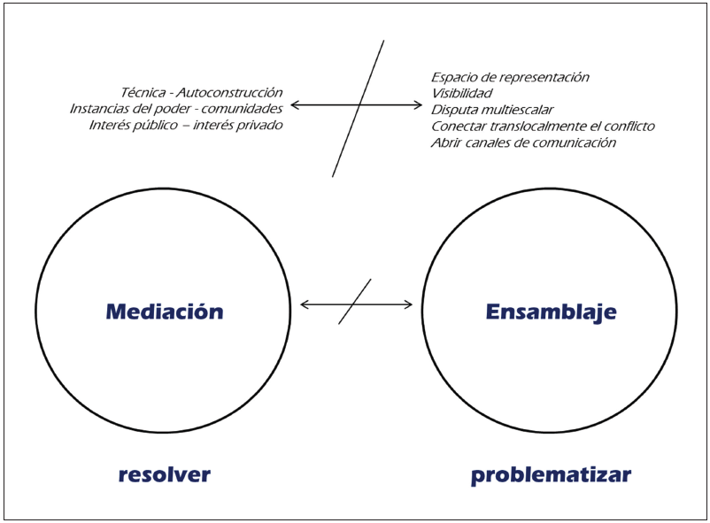 En los asentamientos informales, el arquitecto puede servir de intermediario en tres frentes: entre los usuarios y las instancias de poder, entre el saber técnico cualificado y la construcción informal, y entre lo público y lo privado. Eduardo Serrano, arquitecto e investigador sobre la relación del entorno construido y sus habitantes, afirma que los arquitectos titulados han detentado con exclusividad la facultad de mediar entre los hechos construidos y los usuarios.52 Esta afirmación es especialmente pertinente en los entornos autoconstruidos, donde usuario y arquitectura están íntimamente ligados e influidos. Cuando hablamos de mediación, un requisito indispensable es que las partes puedan estar representadas. Los parlamentos se constituyen así de todos los elementos en conflicto reunidos e implicados en la búsqueda de una solución. Esto rara vez ocurre. Siempre existen partes no escuchadas, invisibilizadas o que no disponen de la capacidad de expresarse. Las marginalidades producidas por dispositivos urbanos generalmente son desconocidas. Los asentamientos deben ser entendidos como controversias no resueltas en las que sucesos que ocurren en lugares alejados afectan e interfieren en el dispositivo "barrio informal". Las posibilidades que se abren para el trabajo arquitectónico cuando se empiezan a incorporar miradas ecosistémicas son enormes. La hipótesis que planteamos es que al comprender el carácter político de las arquitecturas de subsistencia empiezan a surgir una serie de demandas sobre el profesional que acomete estas problemáticas.
