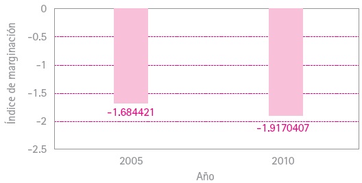 Con relación a las cifras de marginación, al comparar la situación de Zapopan con respecto a periodos anteriores, el Consejo Nacional de Población (CONAPO) dio a conocer que en el 2010 el índice de marginación se ubicó en -1.91704, lo que representó una mejoría con relación a -1.684421 que se obtuvo en 2005 (Gráfico 2).27 Con esta cifra, se ubicó como el segundo municipio con menor marginación a nivel estatal, con una calificación de Muy baja marginación. En el ámbito nacional, Zapopan mejoró considerablemente su posición, ya que pasó de ser el lugar 96 de los municipios con menor marginación en 2005, al número 18 un lustro después.