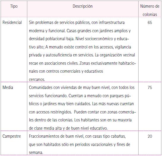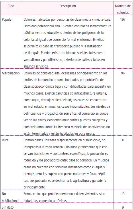 La presión urbana en ciertas zonas del municipio, como Tesistán, el bosque La primavera, el bosque El Nixticuil y la zona de la carretera a Colotlán -originada por la especulación inmobiliaria-, ha ocasionado la proliferación de fraccionamientos y colonias demandantes de servicios públicos. Además, la geografía de la zona metropolitana ha conformado los cinturones de miseria en los municipios vecinos a Guadalajara, siendo la región conocida como Las Mesas en el norte y las colonias aledañas al cerro El Colli en el sur del municipio las dos regiones de Zapopan con mayor cantidad de colonias en situación de pobreza -tema que se analizará más adelante en este documento. Según datos del Centro de Información Municipal (CIM) de la dirección de Programación, Zapopan cuenta con 506 colonias, cuya clasificación se muestra en la Tabla 1.25 Tal agrupación y su descripción indican los contrastes que existen en el municipio, lo que hace particularmente difícil la creación de políticas públicas que resuelvan la problemática de la sociedad que lo conforma.