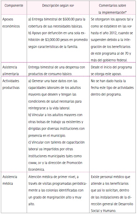 Con relación a los componentes del programa, a partir de 2012 sólo se otorgan la despensa mensual y la atención médica a quien lo solicita, no así la vinculación productiva, el apoyo económico ni el de defunción (Tabla 3). A fin de hacer eficientes los costos de operación y a solicitud de los beneficiarios, a partir de 2013 se realizó la entrega de dos despensas cada bimestre en vez de una mensual.