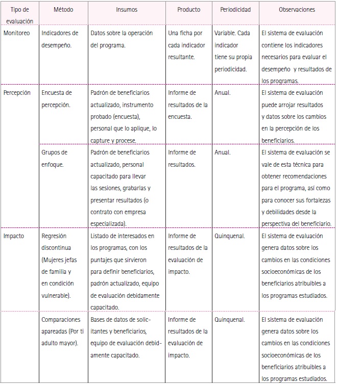 Percepción: Incluye la encuesta de la que se obtendrán datos sobre la percepción subjetiva de los beneficiarios. Adicionalmente, contiene estudios de grupos de enfoque, con los que se conocerán las fortalezas y debilidades desde la perspectiva del beneficiario y se obtendrán recomendaciones acerca de los programas.