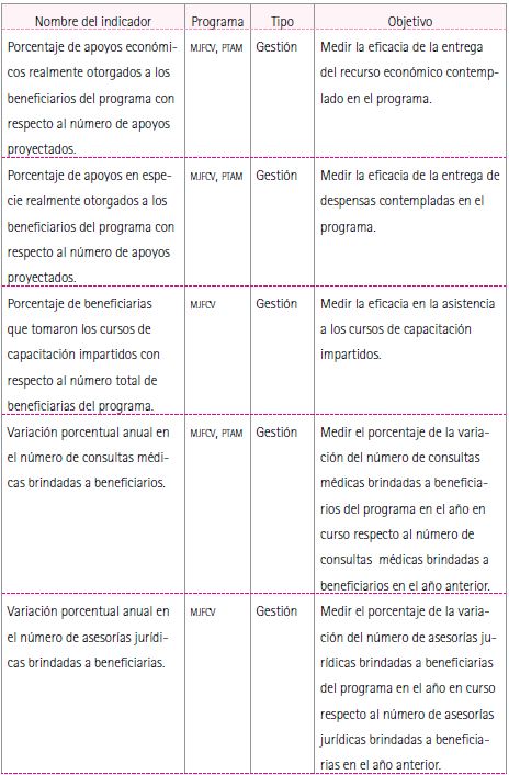 El resultado es la creación de 12 indicadores, de los cuales 5 son compartidos entre ambos programas, 5 son exclusivos del programa MJFCV y 2 de PTAM. Estos indicadores se dividen en dos tipos, según lo que buscan medir: de gestión y de resultados (Tabla 6). De igual forma, se buscó que los indicadores del SIEPSO estuvieran ligados a los objetivos, metas e indicadores establecidos en las ROP, así como a los que ya se manejan en la dirección de Programación.