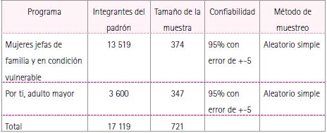 Dado que se conoce el número de beneficiarios de ambos programas, se supone la aplicación de la fórmula para poblaciones finitas con el propósito de obtener el tamaño de la muestra. Así, tomando como base el padrón actual de beneficiarios de cada programa, 95% de confiabilidad y un margen de error de +-5, el número de encuestas a aplicar para el programa MJFCV es de 374, en tanto que para el PTAM es de 347 (ver cuadro metodológico en la Tabla 7).