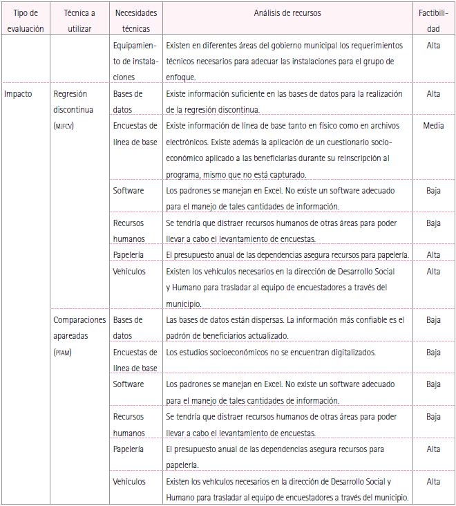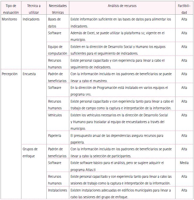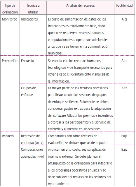 Dado lo anterior, se observa una factibilidad alta tanto para el componente de monitoreo como para el de percepción, dado que se cuenta con los recursos necesarios para realizarlos dentro de la administración municipal, sin embargo se aprecian dificultades en la evaluación de impacto, tanto en aspectos de información disponible de ambos programas, como por cuestiones de recursos humanos y tecnológicos; estos últimos pueden ser cubiertos si se contrata a una agencia externa para llevarla a cabo.
