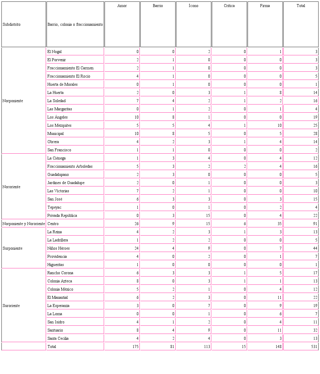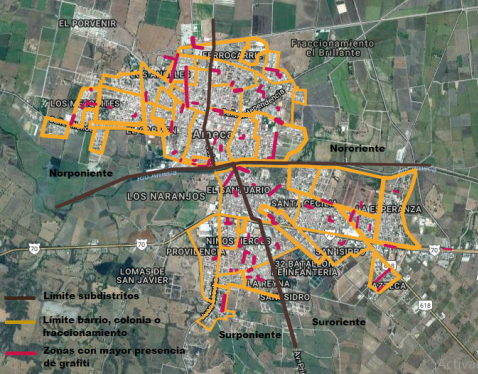 Prácticamente el 80% de las colonias, los barrios y los fraccionamientos de los diferentes subdistritos tiene grafiti (Cuadro 1). Los subdistritos con mayor cantidad son el norponiente (137) y el suroriente (146). En el norponiente los fraccionamientos Municipal y Mezquites son los más pintados, seguidos de las colonias Obrera y La Huerta y los barrios de La Soledad y Los Ángeles. Aquí las colonias y los barrios con menos presencia son San Francisco y Huerta de Morales, y los fraccionamientos El Carmen y El Porvenir, y los de mayor concentración son el Panteón Municipal y el perímetro de la Secundaria 50. En el suroriente el barrio El Santuario concentra la mayoría, seguido de las colonias El Manantial, Rancho Corona, México y Santa Cecilia. El que menos tiene es La Loma. En este subdistrito sobresalen tres espacios con alta cantidad de grafiti: las ruinas de la antigua hacienda La Esperanza, las bodegas semiconstruidas en la colonia La Loma y el paso a desnivel del crucero de la carretera hacia Ahualulco del Mercado.