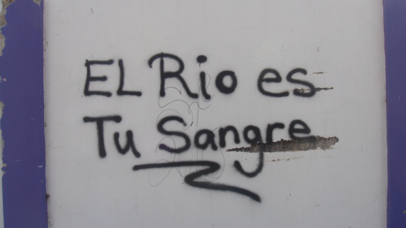 El grafiti alusivo al ícono contiene un par de sujetos individuales (S1-Yo y S2-Tu), siendo la manifestación exclusiva. El sujeto Yo habla en presente, desde el espacio local (Ameca). En el relato este sujeto individual está en relación de conjunción con el objeto “río” y con el objeto “sangre”: S1 ˄ O Río, y, S1 ˄ O Sangre, respectivamente. Al igual que en el grafiti anterior la modalidad de acción tiene que ver con la comunicación-saber. El rol actancial de S1 es de destinador y el del S2 de destinatario. El rol temático es renovar la cultura, siendo las figuras sémicas la Naturaleza y el Ser. En ese sentido los semas nucleares son el territorio, la vida, la simbiosis y el universo simbólico; de ellos podemos reconocer el arraigo como sema dominante y la recreación de los símbolos de la cultura local como isotopía. El territorio amequense es el barrio, el hogar, el terruño. Tiene valor social para quienes residen o nacieron ahí porque la cultura y el espacio son únicos entre las ciudades de Jalisco, por ello es necesario que sus manifestaciones y significados culturales se transmitan entre sus pobladores, utilizando el grafiti para hacer contacto con otros y buscar la identificación.