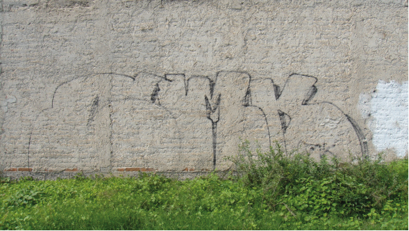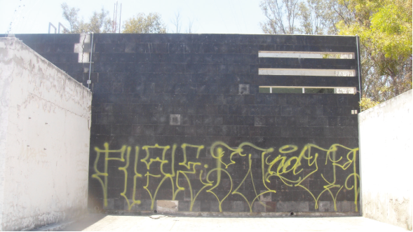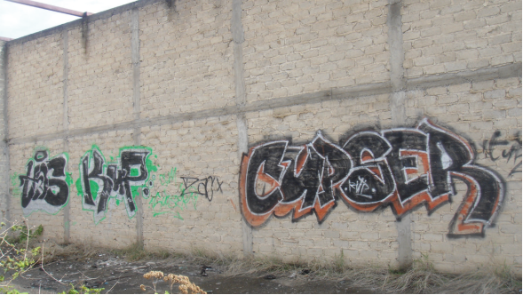 La mayoría son del tipo tag. Debido a su enorme cantidad, decidimos fotografiar solamente una muestra. Su forma varía (de lo legible a lo cifrado), al igual que el color (blanco, negro, verde, azul, principalmente) y el tamaño (pequeño y mediano; pocos grandes). El contenido es “tradicional”, lo que significa que versan sobre apodos o nombres de quienes los hacen o los que pertenecen a determinado crew, barrio o pandilla (Imágenes 2 y 3). Algunas pocas firmas se acompañan de la imagen de una corona de rey o el número 13. Tienden a agruparse en algunas bardas y, en general, las firmas no están encimadas con otras o tachadas por otros grafiteros.