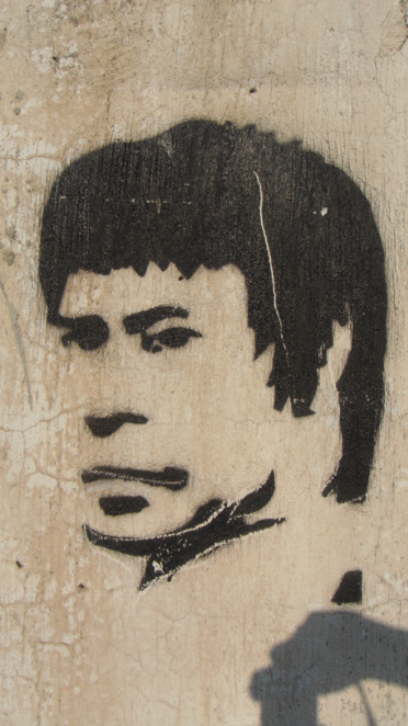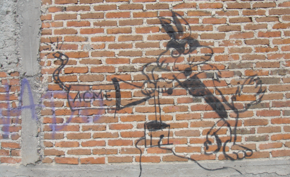 Otros tipos identificados fueron el character (personaje) y el ícono. El ícono tiene una carga simbólica y el character una carga lúdica. Los grafitis de este último tipo retoman personajes de películas y dibujos animados en tanto que los íconos representan arquetipos y símbolos religiosos, sexuales y de la identidad de cholos45 y pandilleros.46 Los íconos religiosos son coloridos y los sexuales y de cholos y pandilleros tienen color negro, al igual que los personajes. Los del tipo character son de mediano tamaño y los otros de mediano y gran tamaño. En la mayoría de los personajes se utiliza esténcil, mientras que los icónicos se hacen “a mano alzada” (Imágenes 6, 7, 8 y 9).