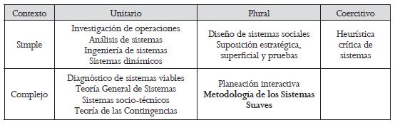 Para cumplir dicho cometido se utilizó la Metametodología de Intervención Total de Sistemas37 en la que se relacionan dos dimensiones: tipos de sistemas, referido a la complejidad que presenta la situación problema y tipos de participantes, que se refiere a la relación entre los individuos o partes involucradas en el sistema.