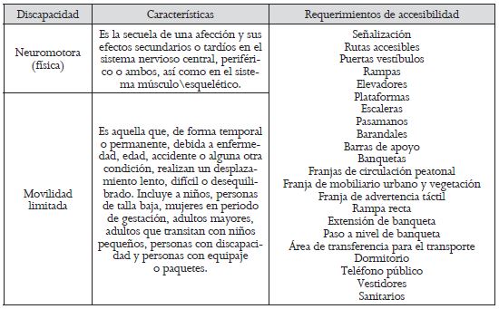 Con base en el Manual de Normas Técnicas de Accesibilidad42 se diseñaron fichas de observación de los elementos de accesibilidad y para el presente artículo se presentarán los resultados obtenidos sobre las personas con discapacidad neuromotora y movilidad limitada debido a que representan la mayoría porcentual en México con un 64 % de acuerdo con el Instituto Nacional de Estadística y Geografía.43