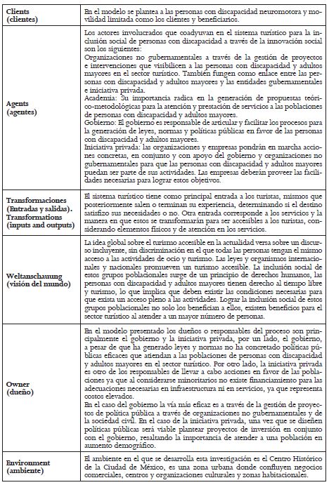 El modelo del sistema turístico planteado pretende identificar elementos donde se puedan generar procesos de innovación social y coadyuvar a la inclusión de las personas con discapacidad en el sistema turístico del Centro Histórico de la Ciudad de México.