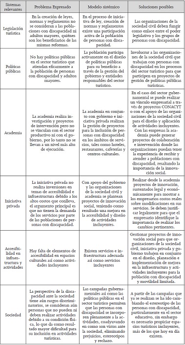 La Metodología de Sistemas Suaves permitió identificar los elementos en el Sistema Turístico que pueden propiciar la inclusión social; si bien se tiene un marco legal estructurado y vinculado a la normativa internacional la brecha es clara entre el sector gubernamental y el sector privado. Esta brecha puede disminuirse a través de las organizaciones de la sociedad civil que trabajan con las personas con discapacidad.