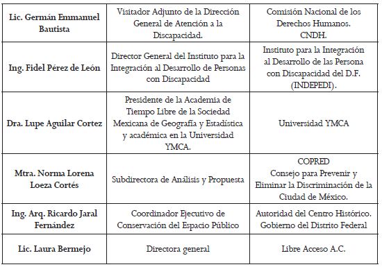 Para este paso se obtuvo información de entrevistas a profundidad realizadas a un grupo de expertos, el cual incluyó funcionarios públicos, miembros de organizaciones de la sociedad civil y la academia.45 La entrevista se realizó sobre tres ejes principales vinculados a la discapacidad: inclusión social, marco legal, tiempo libre y turismo en el Centro Histórico de la Ciudad de México. En la siguiente figura se presentan las personas expertas y su cargo laboral al momento de realizar las entrevistas.