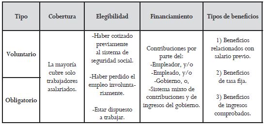 Se distinguen dos tipos de esquemas de seguros de desempleo, el obligatorio y voluntario. El primero cubre una mayor parte de la población trabajadora pues su población objetivo son todas las personas que han perdido su trabajo, considerando que se sometan a ciertos requisitos. Su financiamiento generalmente corre por cuenta de un sistema mixto de contribuciones y de ingresos del gobierno. Ejemplos de estos los poseen países como Alemania, Austria, Canadá, Reino Unido, Francia, España, Portugal, Italia, Grecia, Noruega y Bélgica.21