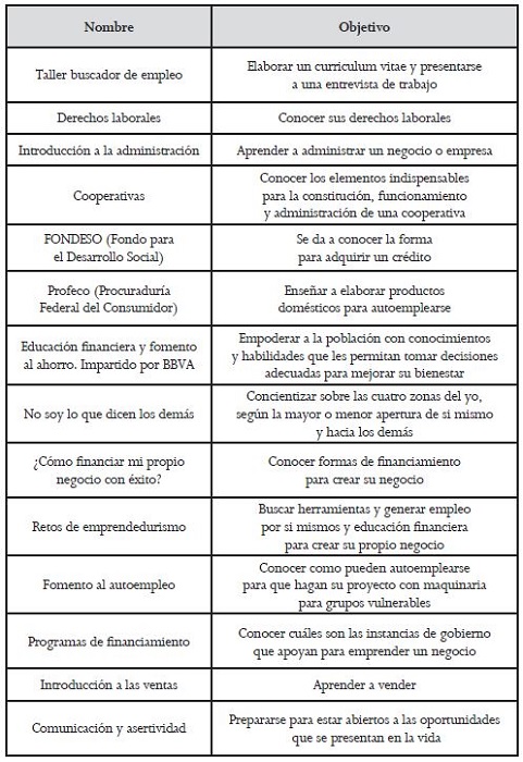 La DGECyFC (Dirección General de Empleo, Capacitación y Fomento Cooperativo) y el mismo Seguro de Desempleo se encargan de impartir tales talleres con duración aproximada de dos horas, también el ICAT (Instituto de Capacitación para el Trabajo) ofrece cursos de liderazgo gerencial con certificación de la SEP (Secretaría de Educación Pública) con una duración de 20 horas. Hasta julio del 2016, en este último tipo de curso, cerca de 306 participantes recibieron sus constancias con valor curricular. La selección de la temática de los cursos va por cuenta de la Dirección del Seguro de Desempleo, que la fija con base a la educación de la población solicitante. A continuación, se presenta un pequeño listado de cursos y su objetivo.