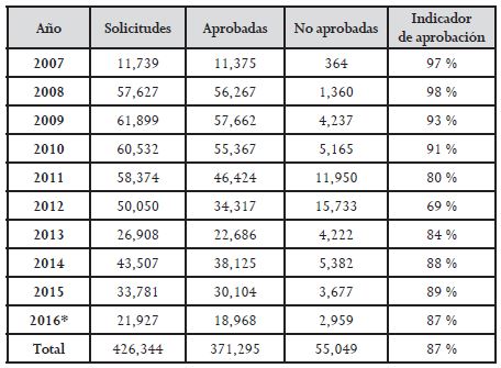 El porcentaje de solicitudes aprobadas sobre las presentadas es alto, con un máximo de 98 % en el año 2008 con 56 267 personas apoyadas. El año con menor porcentaje de solicitudes aprobadas fue el 2012, donde solo se autorizó el 69 % de las solicitudes, por cuestiones de presupuesto. El promedio de este indicador entre año 2007 y 2016 es del 87 %.