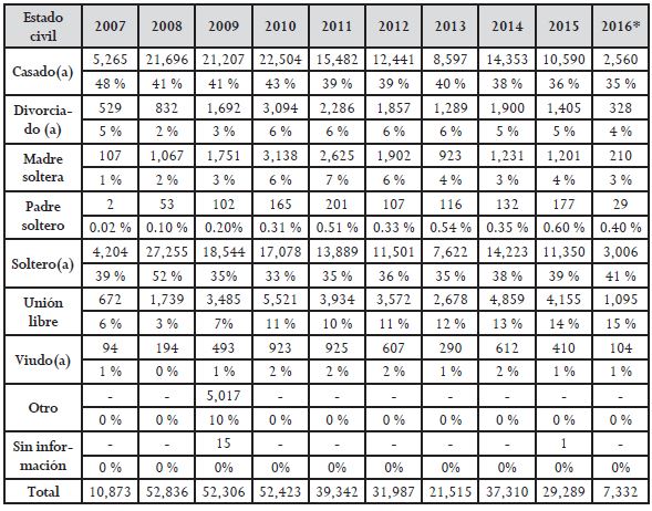 A través de las solicitudes de ingreso y la documentación requerida, la Dirección del Seguro de Desempleo obtiene datos sociodemográficos de los beneficiarios. En el año 2015 los beneficiarios según su estado civil fueron: personas solteras, 39 %; casadas con 36 %, con una tendencia a la baja; unión libre con 14 % y con tendencia al alza; divorciadas o divorciados con el 5 %; madres solteras con el 4 %; padres solteros con 0.60 %; y viudas o viudos con el 1 %.