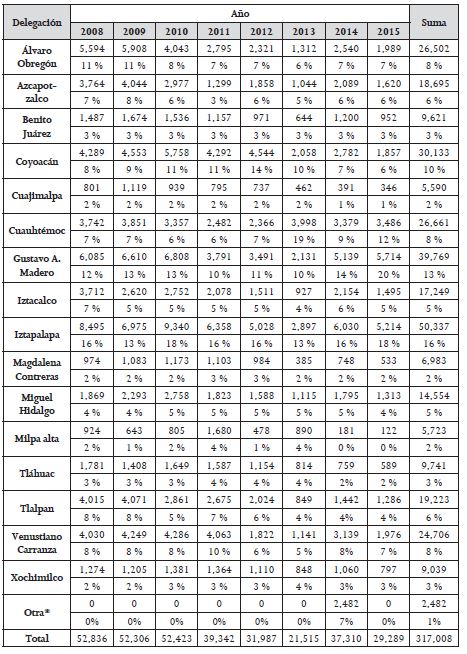 Analizando a los beneficiarios por delegación, es posible observar como en el periodo comprendido por los años 2008-2015,109 la delegación en dónde más personas solicitaron ayuda y fue beneficiada fue en Iztapalapa con un total de 50 337 personas en un curso de 8 años, que representaron el 16 % del total. Le siguen Gustavo A. Madero y Coyoacán, con el 13 y el 10 % del total respectivamente.
