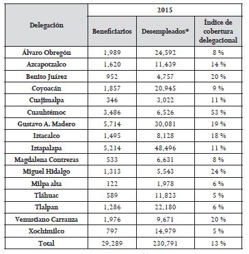 Para aislar el efecto del tamaño de la población potencial objetivo, se realizó un índice de cobertura por delegación, es decir, el porcentaje de beneficiarios en relación con el total de desempleados de cada delegación. En primer lugar, Cuauhtémoc, dónde se ubican las oficinas centrales del Seguro de Desempleo, es la delegación que más cobertura ha tenido, con un índice del 53 %, seguida de Miguel Hidalgo con 23 %, así como Benito Juárez y Venustiano Carranza, ambas con el 20 %. En el otro extremo se encuentran Tláhuac y Xochimilco, ambas con 5% %, así como Milpa Alta y Tlalpan, ambas con 6 %. Los beneficiarios consultados por medio del cuestionario señalaron que sería deseable que se les atendiera en su delegación de origen, para no tener que trasladarse a oficinas centrales.