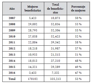 Por sexo, del 2007 al 2013, las mujeres dominaban como receptoras de la ayuda, lo que coincide con lo encontrado por Bensusán,111 pero a partir del 2014 fueron los hombres quienes recibieron más apoyos.