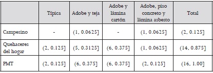 Las viviendas, 31 en total,47 son en su mayoría de muros de adobe, con o sin acabados; los techos son por lo común de teja, aunque existen algunos que emplean lámina de cartón o de asbesto; el piso por lo general es de tierra, si bien hay algunas familias que ya cuentan con piso de concreto (Cuadro 1). Mencionan que anteriormente utilizaban un tipo de zacate para el techado, aunque en la actualidad es difícil de conseguir, además de que es inflamable, este ha caído en desuso. Casi todos los hogares poseen una cocina o enramada hecha con palos, morillos y horcones de árboles del monte de la misma localidad y con techo de lámina de cartón o de teja.