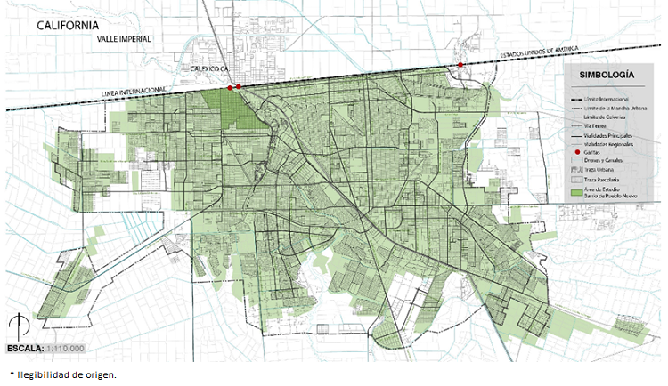 Si bien la creación de la calzada de los Presidentes contempla el reintegrar la dispersa estructura urbana de Mexicali, hasta ahora no se han llevado a cabo las propuestas planteadas por el Programa parcial de desarrollo urbano del Río Nuevo49 para vincular esta vialidad con las áreas adyacentes y establecer un espacio de transición entre ellas. De tal manera que, además de no haber sido publicado ningún instrumento de planeación con estos objetivos, Pueblo Nuevo, uno de los principales barrios con vecindad al Río Nuevo, se ve impactado con problemáticas urbanas y sociales.