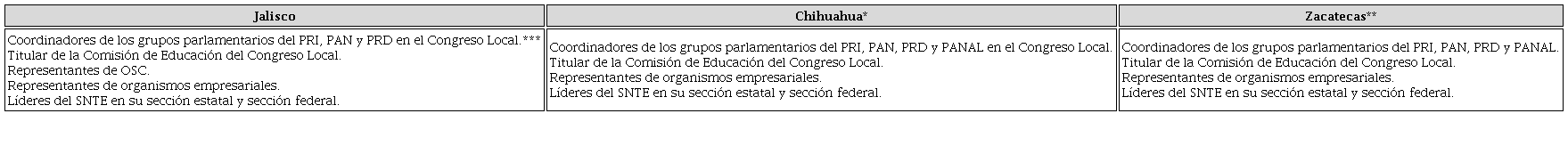 Una cuestión importante para observar en el contexto de Jalisco es que el sindicato no contaba con representación en el Congreso del Estado mediante su brazo político, el PANAL, y que uno de sus primeros planteamientos en la estrategia de cabildeo de la reforma educativa fue analizar cómo hacer la negociación sin contar con aliados directos en la arena legislativa. En este orden de ideas, Jalisco es una entidad federativa en la que la disputa por la reforma educativa en lo local se libró entre dos grupos definidos.