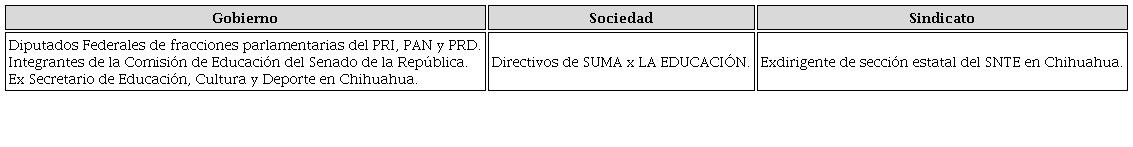 En ese contexto se cuenta con testimonios, recogidos en entrevistas a profundidad, en el que se reconoce la participación del grupo Mexicanos Primero en la asesoría a la comisión de educación del Congreso del Estado; gran parte de su aportación consistió en revisar la iniciativa, presentada por el gobernador del Estado, y los planteamientos de las fuerzas políticas al momento de negociar los artículos. Durante el proceso, el brazo jurídico de la agrupación se avocó a detectar aquellos artículos que corrían riesgo de contravenir las disposiciones federales, mismos que informó a los diputados para su análisis y corrección.54 Las fuerzas políticas estuvieron en medio de las opiniones de cada uno de los bandos que pugnaban por la reforma.55