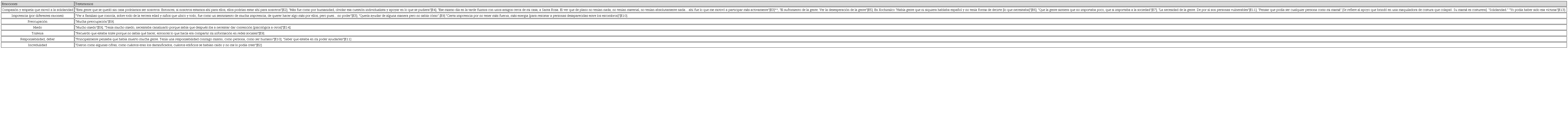 Así mismo, los testimonios revelan que las emociones también influyeron en la calidad de la ayuda que brindaron los entrevistados (y otras personas), aun cuando esta no fuera desde su saber profesional. La creatividad y capacidad de iniciativa que desplegaron muestra la sensación de capacidad de agencia que produce la acción colectiva.106 Pensaron en acciones y en formas de llevarlas a cabo (estrategias) que las autoridades normalmente no consideran, logrando que fuera más humanitaria que la brindada por las autoridades. Para ello, fue importante su sensibilidad para considerar las condiciones específicas de la población afectada (compasión), por ejemplo, que se tratara de población vulnerable o que no habla español, como muestran los relatos en la Tabla 1 y los que citamos a continuación.